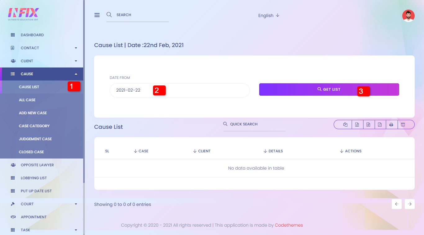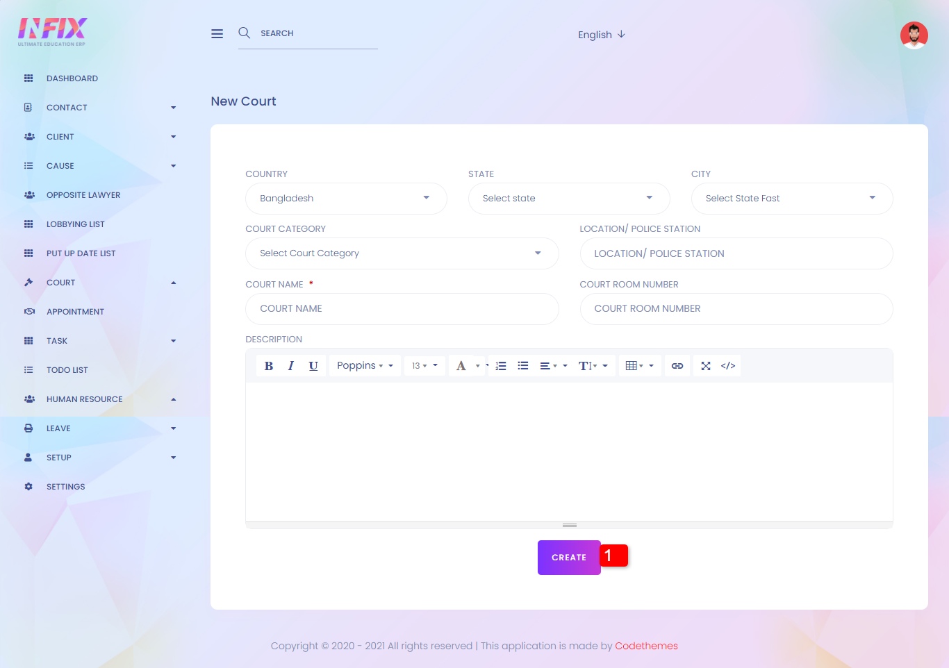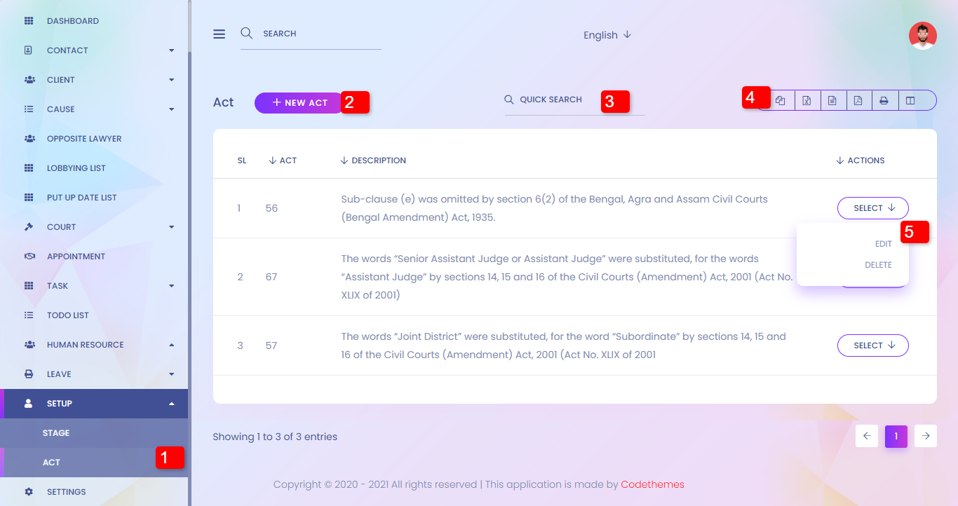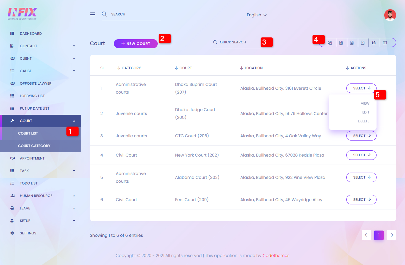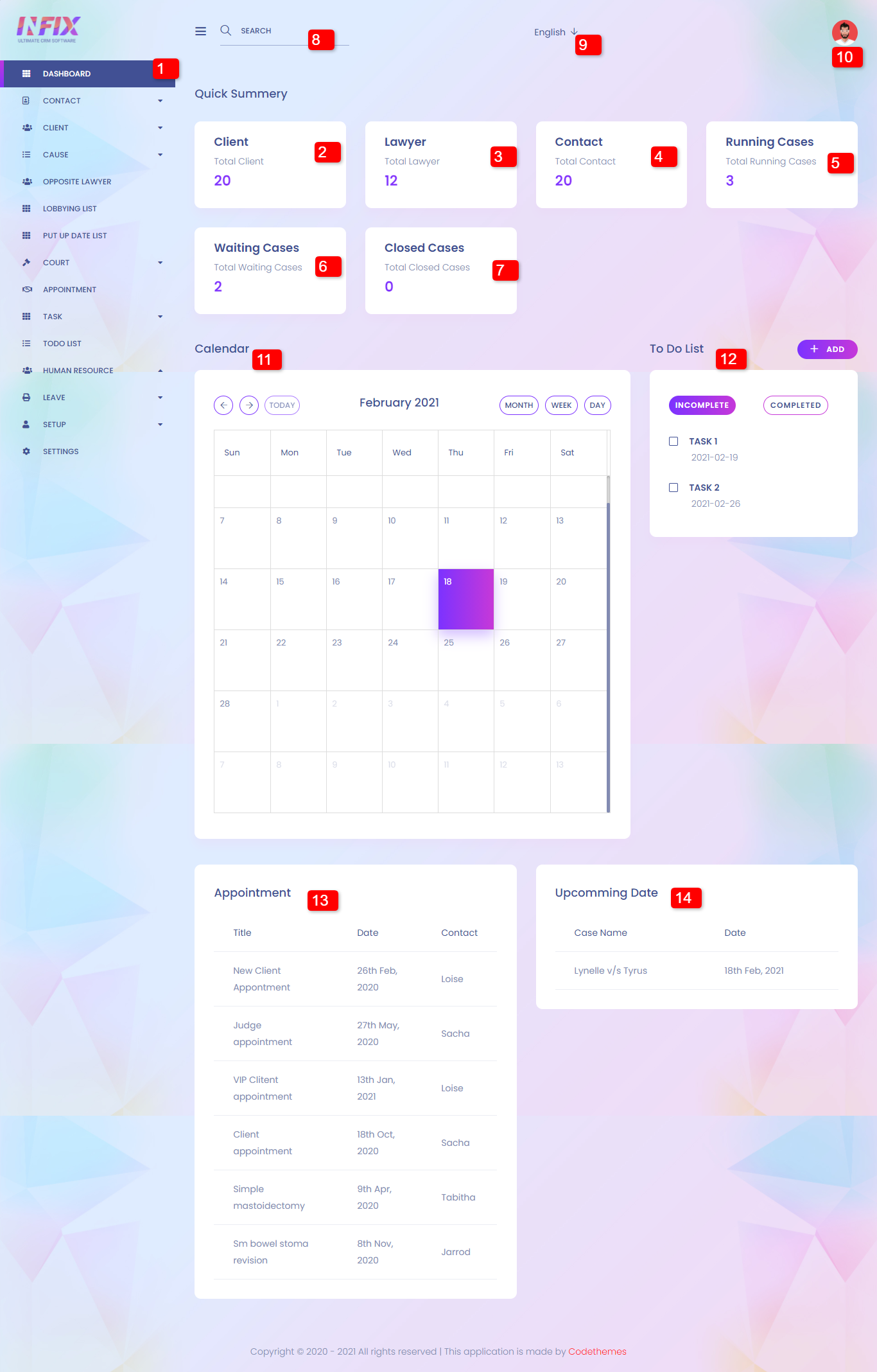 At the top menu of left sidebar is Dashboard. There are several view port in dashboard. we can see the number of case, Court and contact etc. at a glance. After login a user can see the update for that day.