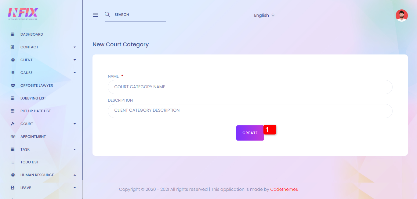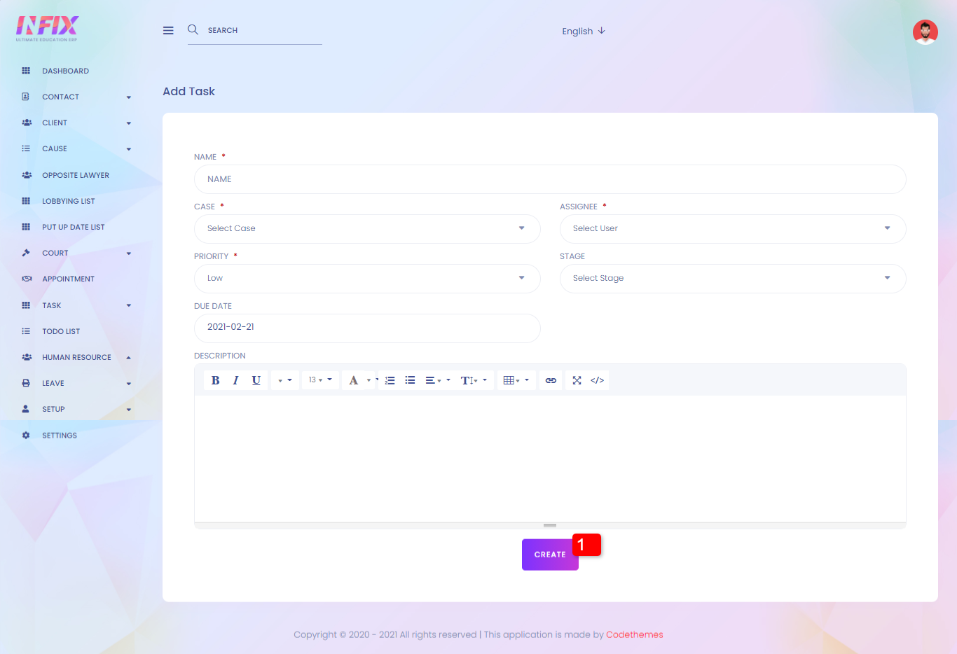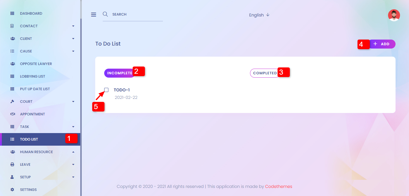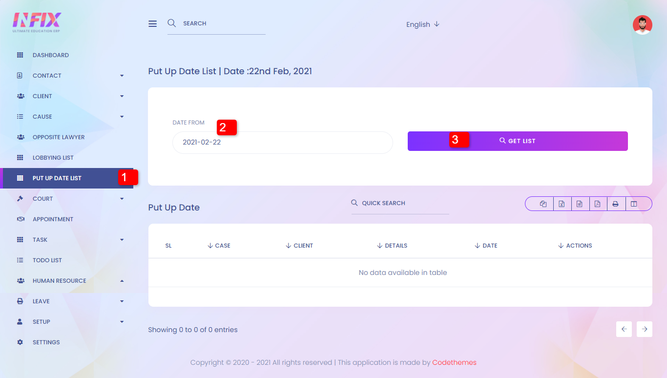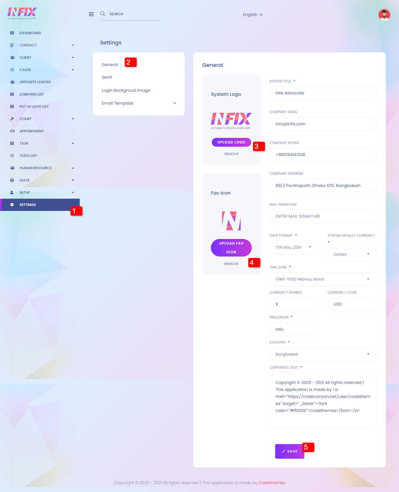 At the top menu of left sidebar is Dashboard. There are several view port in dashboard. we can see the number of case, Court and contact etc. at a glance. After login a user can see the update for that day.