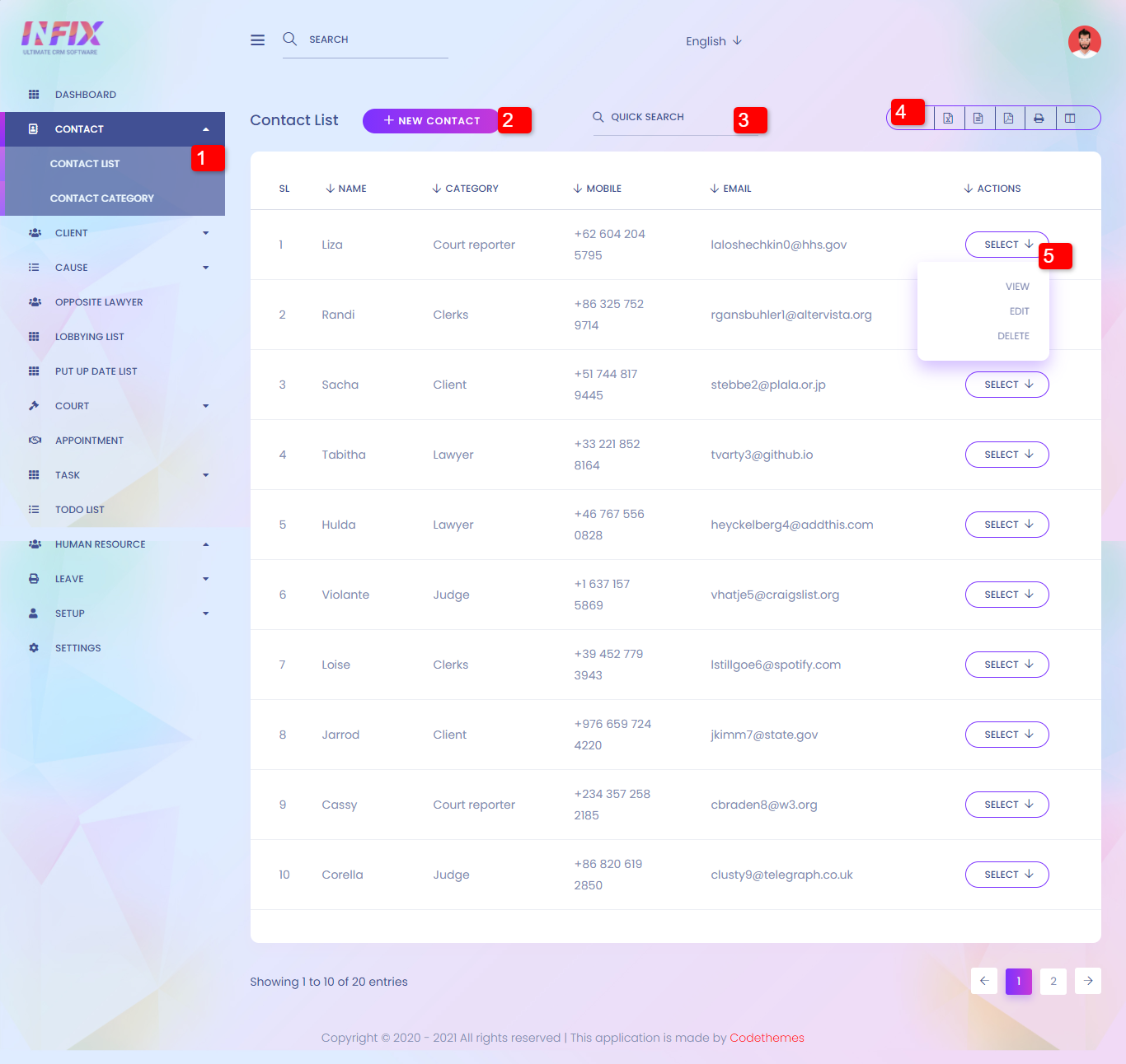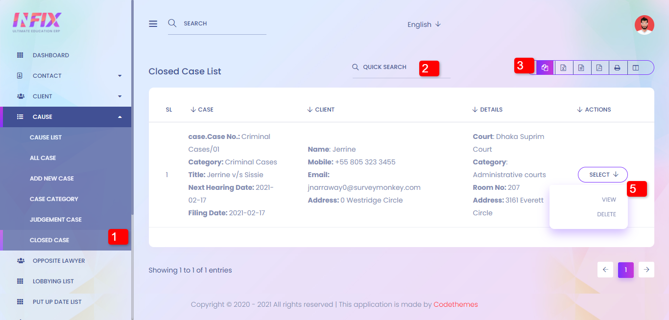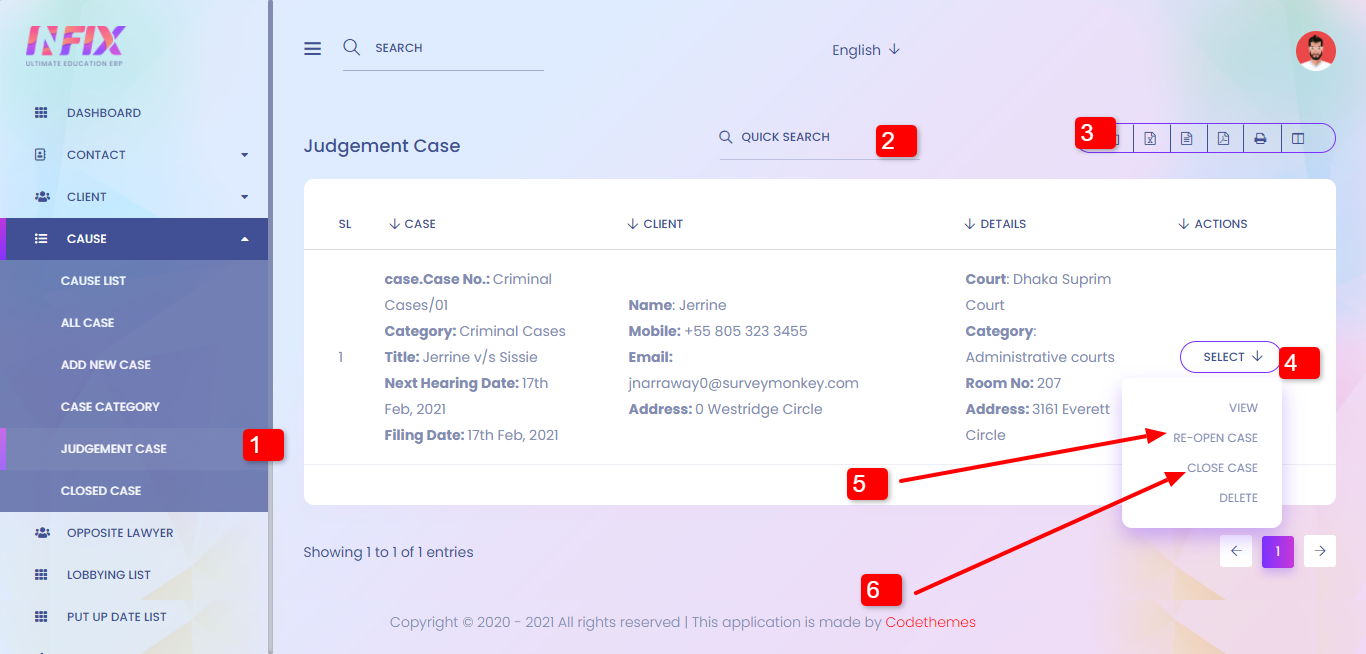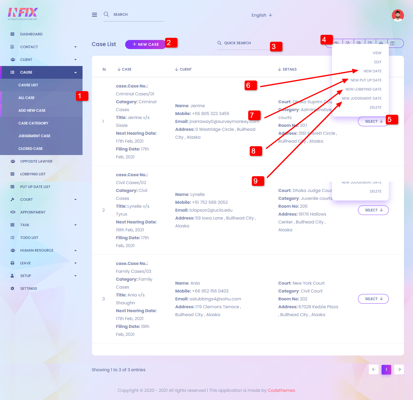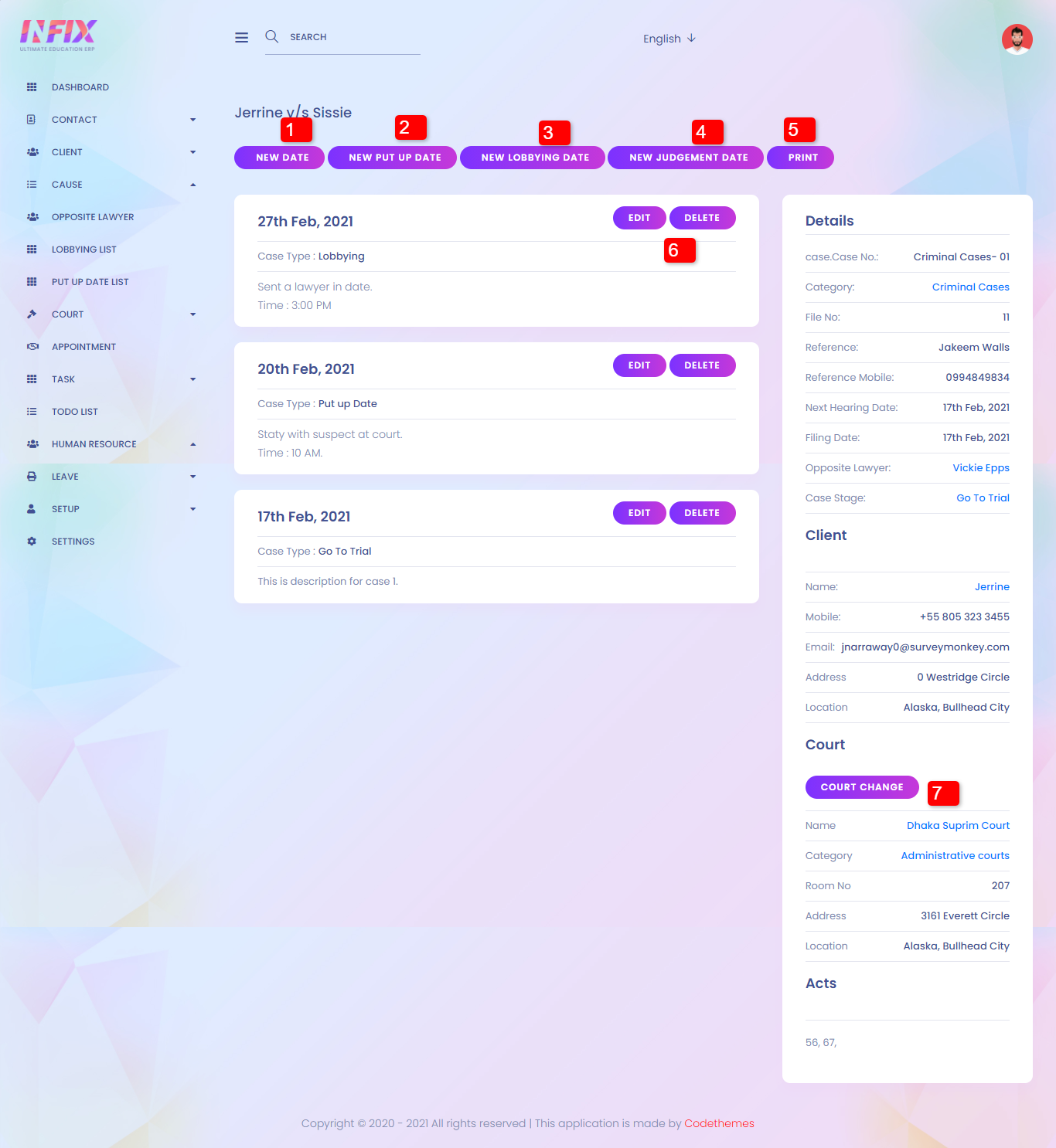 From those section we can khow about number of Client, Lawyer, Contact, Rumming case, Closed Case.