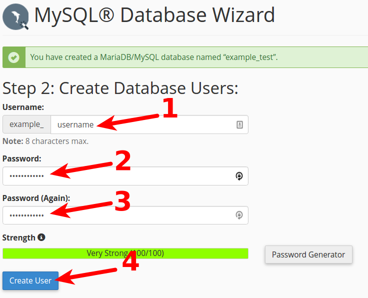 Next to Username enter a username.Enter a password next to Password, enter it again for Password (Again) and then click Create User.