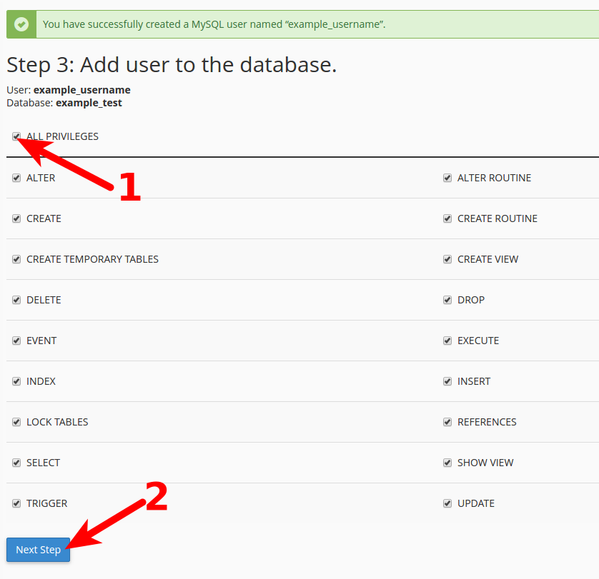 On the next page, you'll assign privileges for the user to the database. Check the box next to All Privileges and then click Next Step.