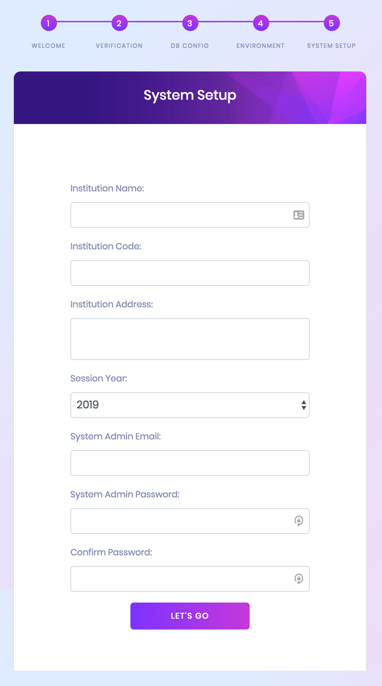 Type in Administrator Details, Site Settings, Default Academic Year & License Code. Then Press Next Step