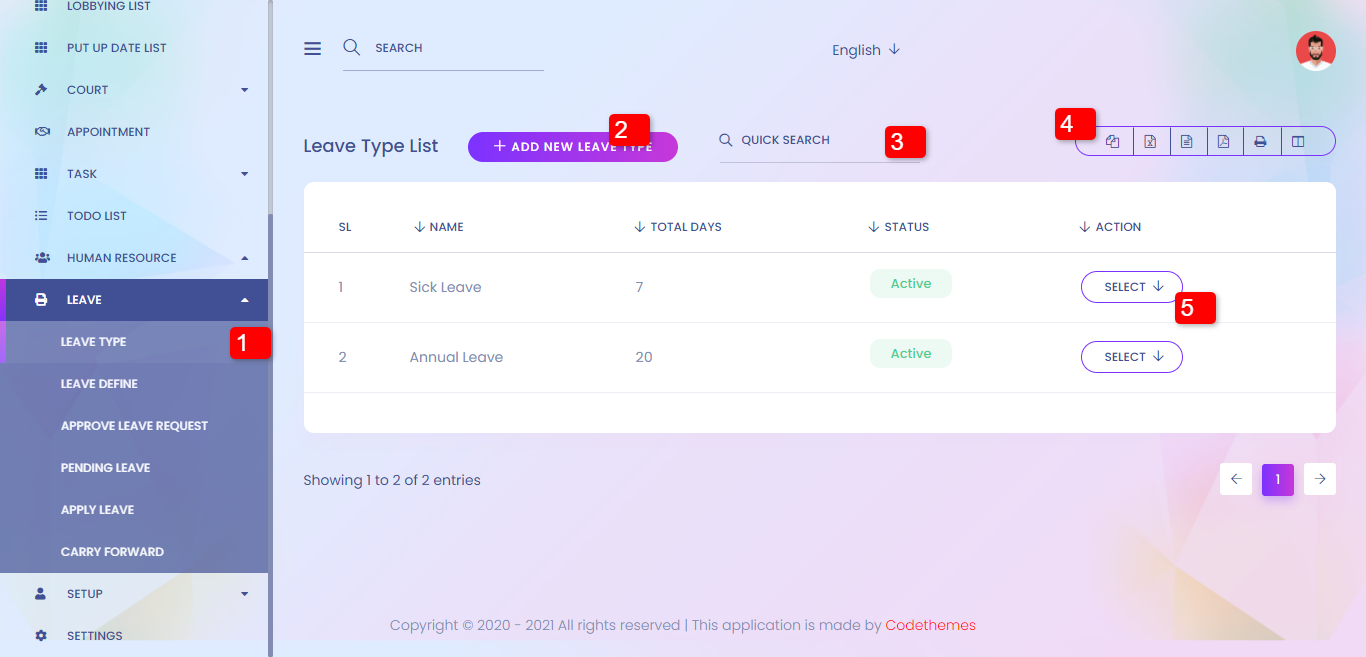 There are several option(Copy, CSV, xls, print and pdf) to export the list data. The last option for manage column visuality.